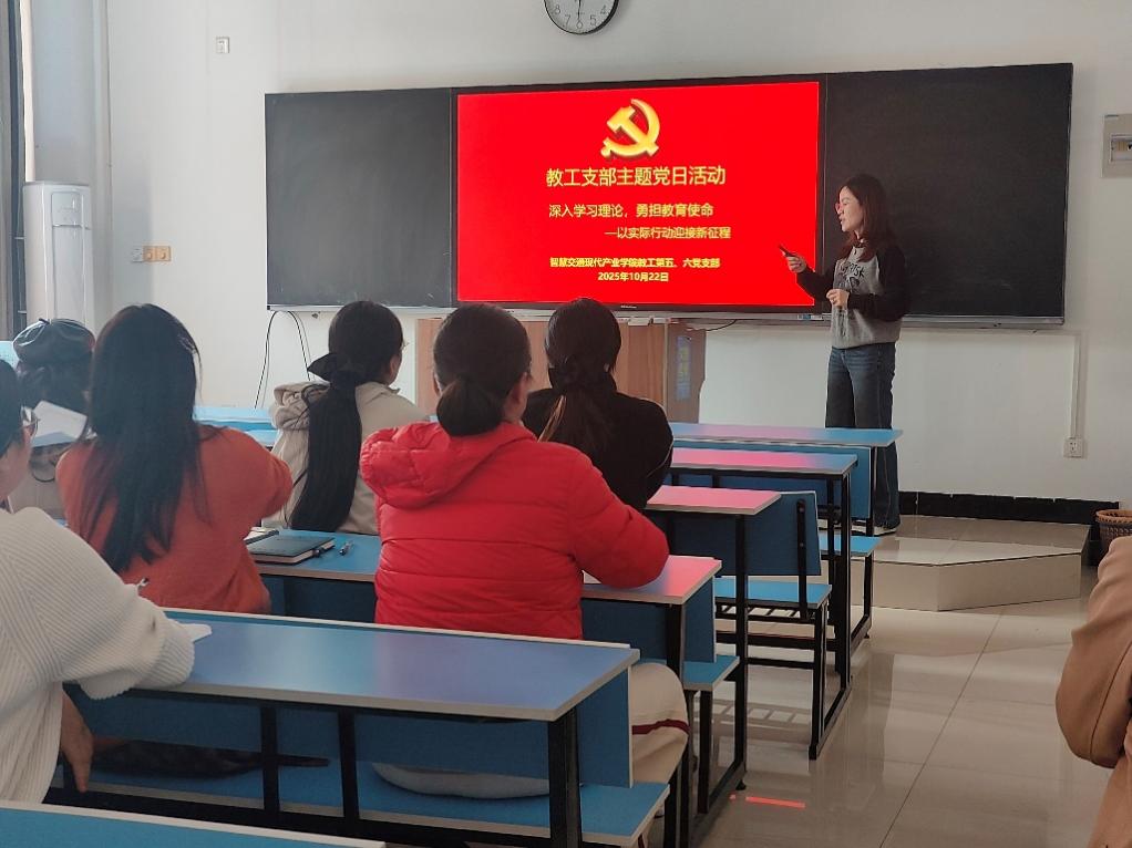 为深入学习贯彻习近平新时代中国特色社会主义思想,全面落实立德树人根本任务,10月22日智慧交通现代产业学院教工第五、第六党支部组织开展了“深入学习理论,勇担教育使命”主题党日活动,两个支部的全体党员教师参加。