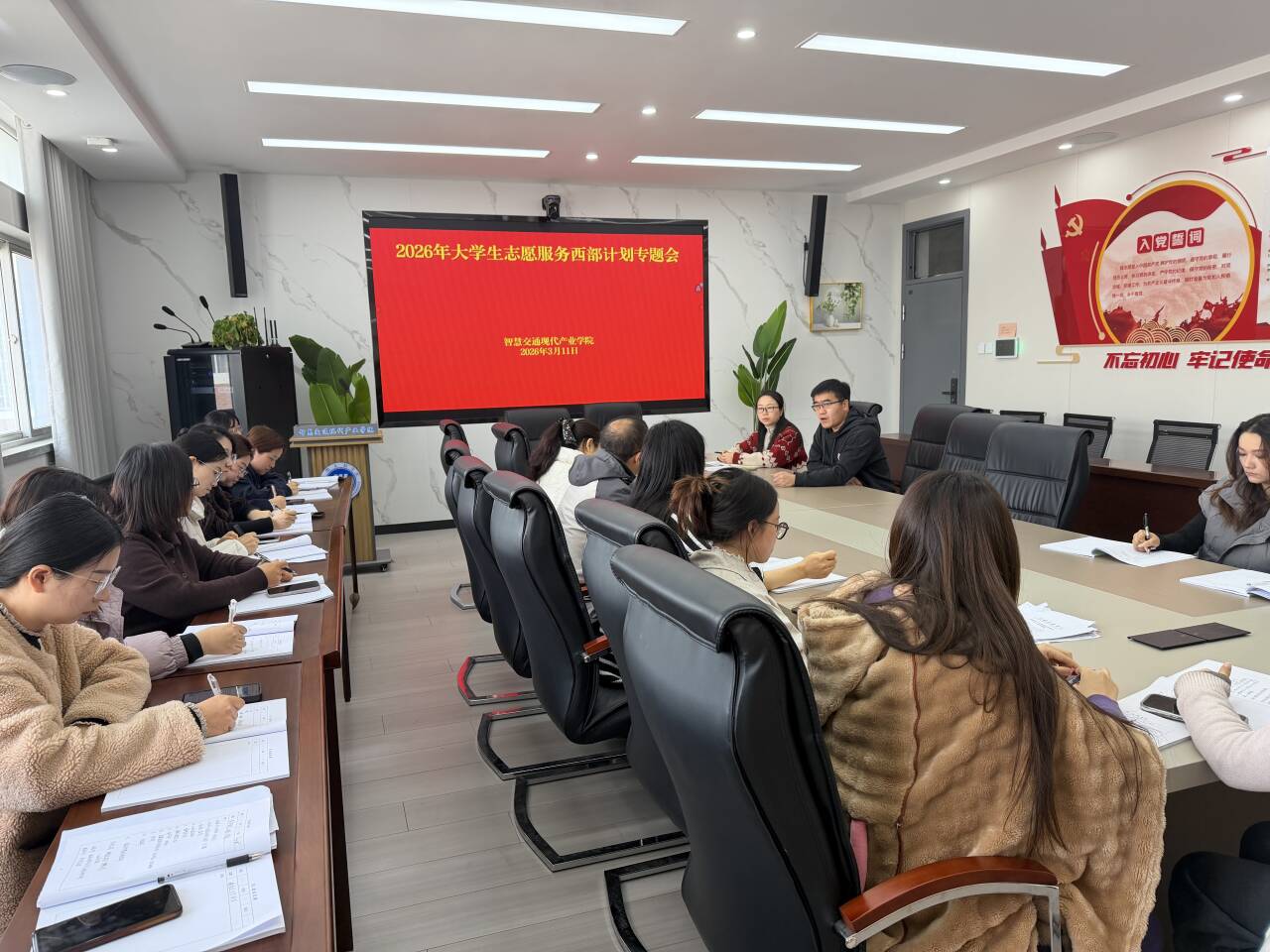 为深入贯彻落实大学生志愿服务西部计划政策精神,引导广大青年学生到基层和西部建功立业。3月11日,智慧交通现代产业学院在学院会议室召开了大学生志愿服务西部计划专题会。会议由院团委书记余雯丽主持,学管主任王金果、田洁及全体辅导员参加会议。