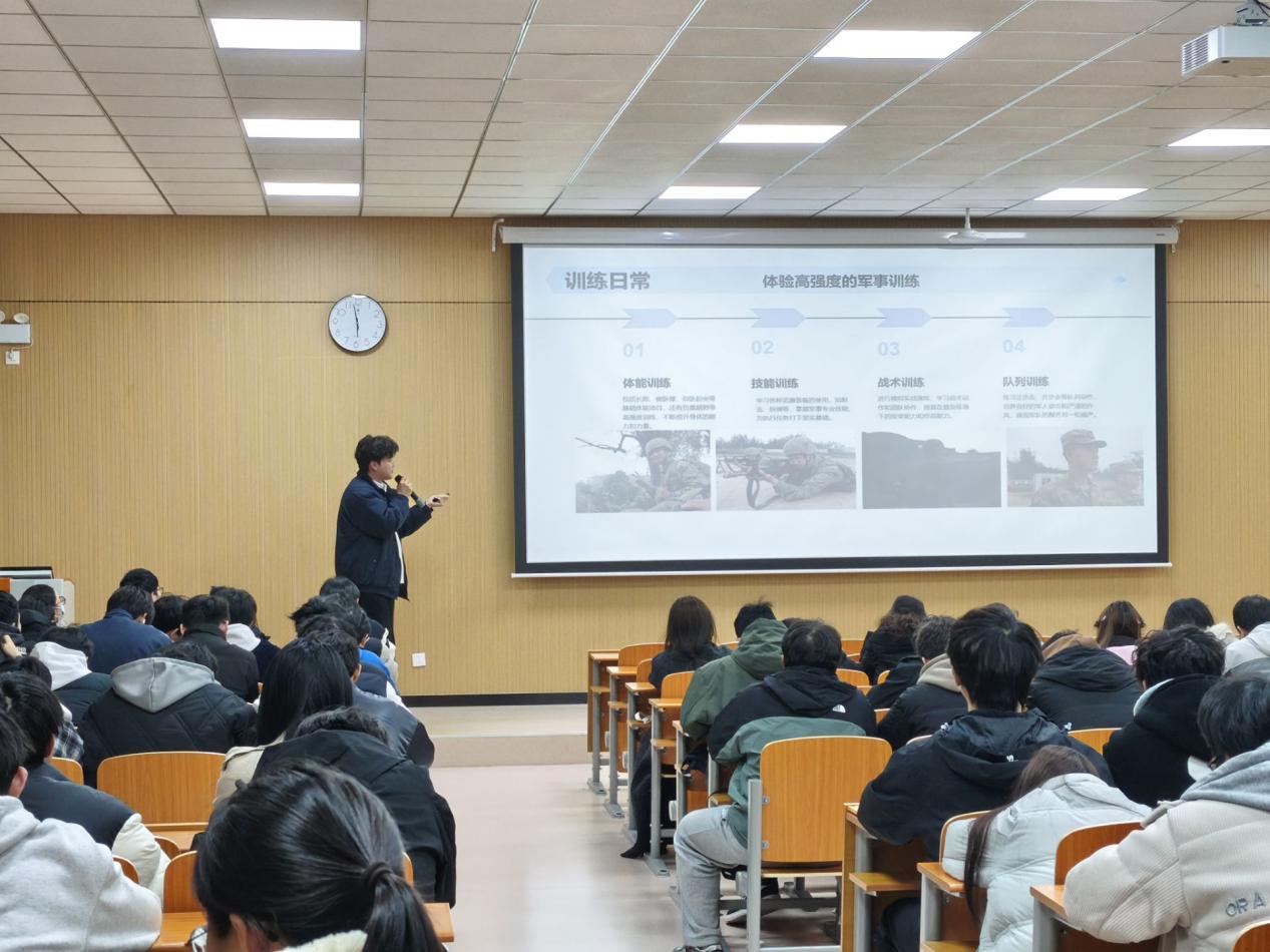 有的分享了兼顾学业与校园活动的经验,在励志奖学金、志愿服务与社团实践中不断提升综合能力。还有一位退伍学生分享了军旅生活的收获与感悟,详细介绍了入伍的基本条件、报名流程及政策优待,鼓励同学们将爱国之心化为报国之行,在军营中淬炼品格、增长才干。真实而生动的分享,让在场同学深受启发,现场交流氛围热烈。