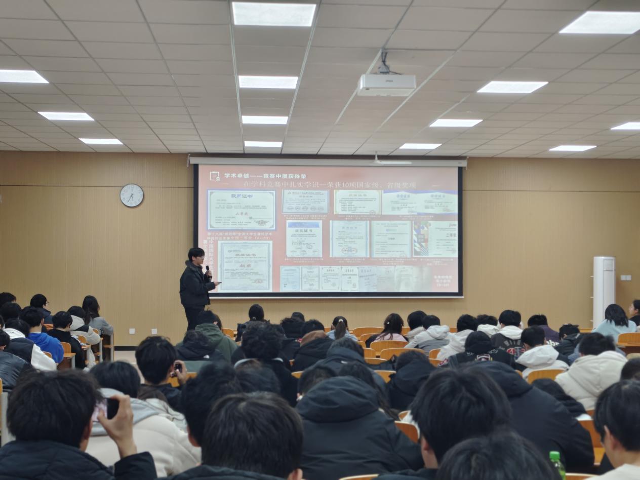 活动中,四位优秀学子结合自身成长经历,从不同角度展开分享:有的围绕学生工作与专业学习的平衡,讲述了在服务师生中锻炼统筹协调能力的心得;有的聚焦学科竞赛,回顾了从选题构思到反复调试、最终斩获奖项的奋斗历程。